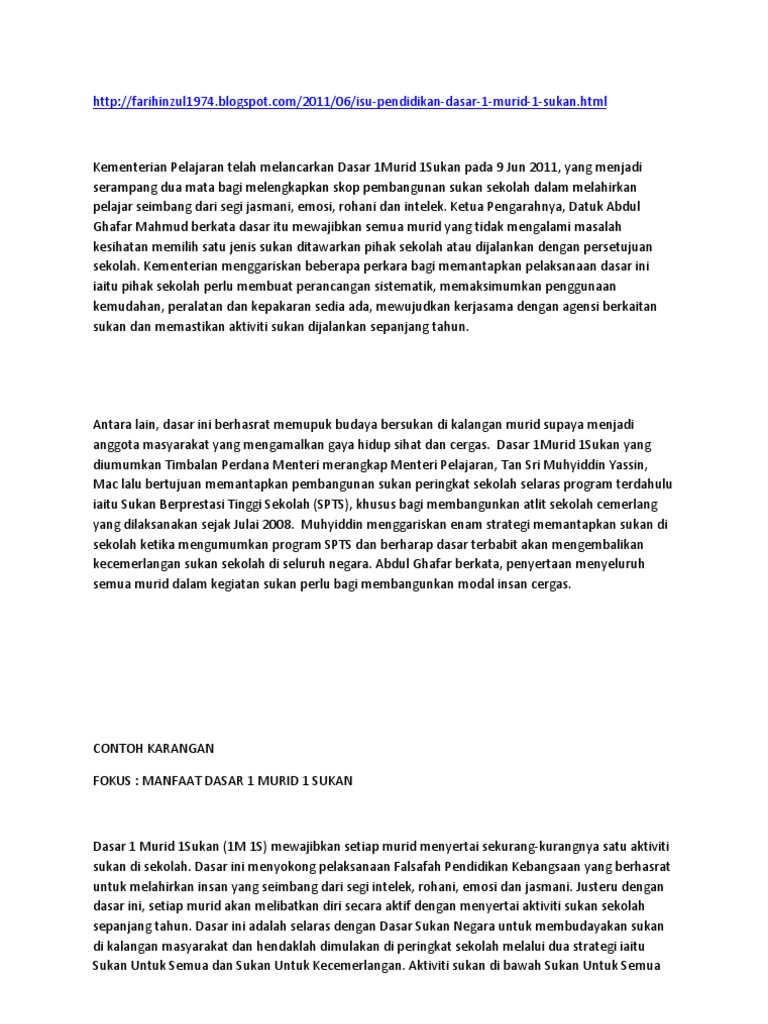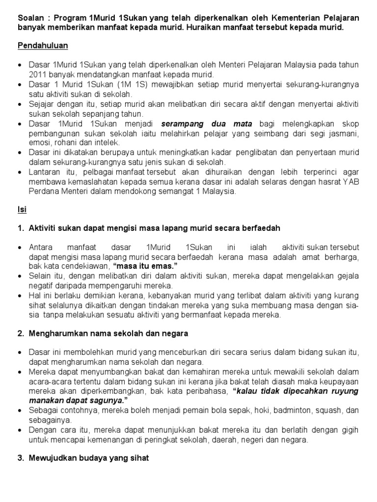 Dasar 1Murid 1Sukan telah diperkenalkan pada tahun 2011. Rangka Karangan Pendahuluan - Program 1Murid 1Sukan - pembangunan sukan sekolah ke arah meningkatkan kadar penyertaan murid dalam sekurang-kurangnya satu jenis sukan di sekolah Isi i. 100 karangan contoh pmr dan spm malay language.